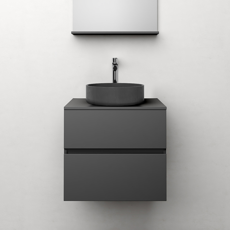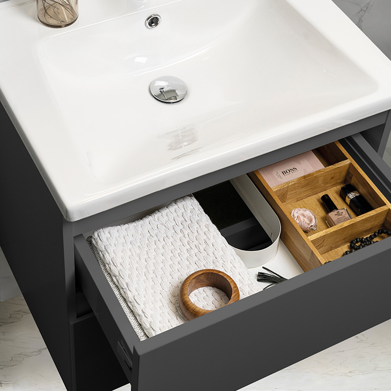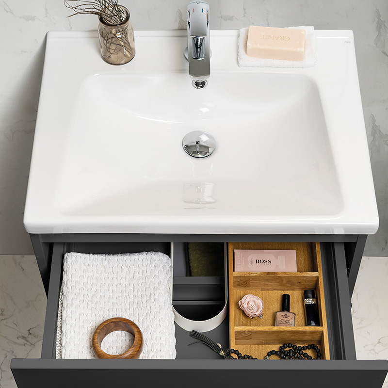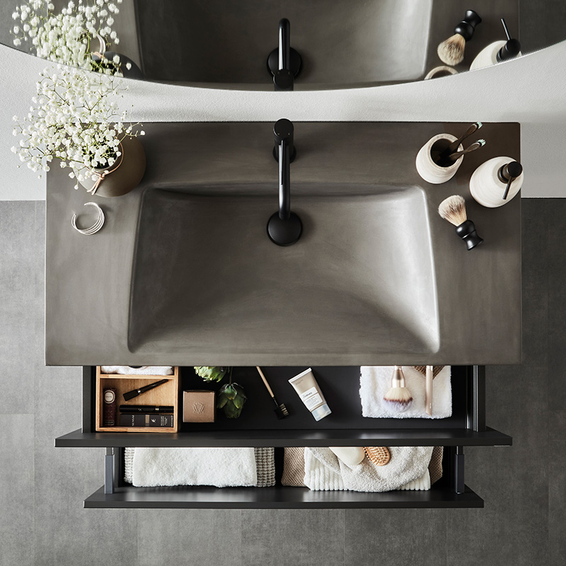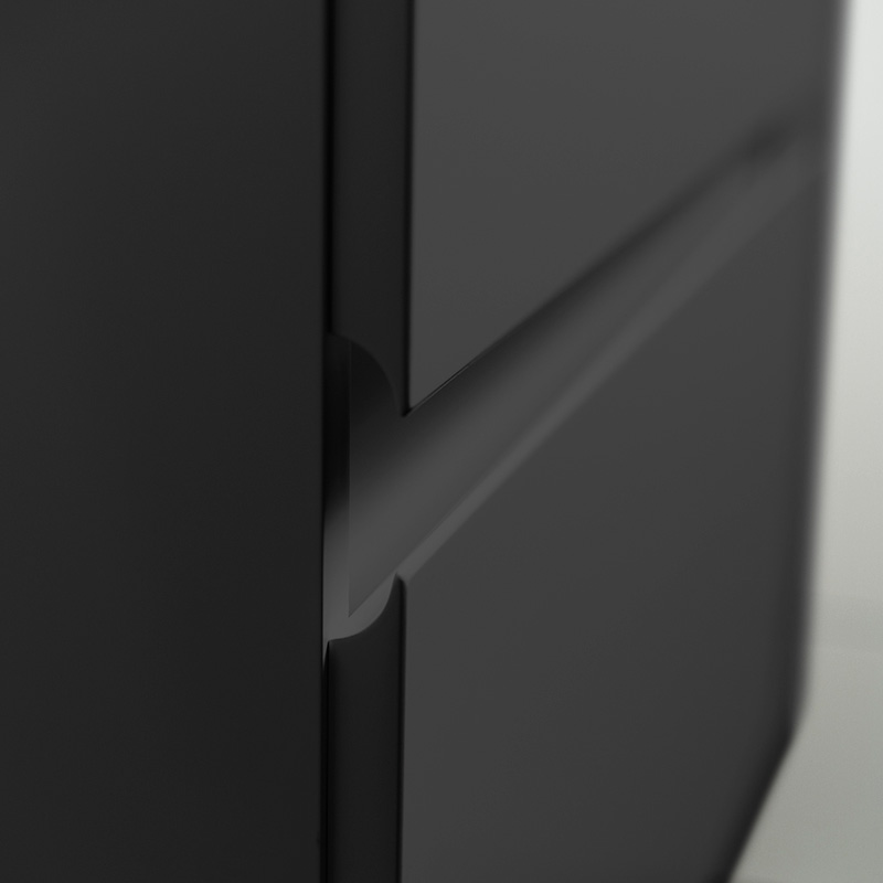 Himmel er et stilfuldt håndvaskskab med blødlukkende skuffer med integrerede håndtag. Skufferne kan trækkes helt ud og har metalkanter. En aftagelig måtte i bunden af skufferne holder tingene på plads og gør rengøringen nemmere. Den øverste skuffe har et U-formet design, der giver plads til en vandlås. Skabet er forberedt til både gulv- og vægafløb og har justerbare monteringsbeslag. Fås i mat hvid og antracit. Vandlås tilkøbes separat.