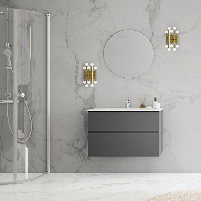 Himmel er et stilfuldt håndvaskskab med blødlukkende skuffer med integrerede håndtag. Skufferne kan trækkes helt ud og har metalkanter. En aftagelig måtte i bunden af skufferne holder tingene på plads og gør rengøringen nemmere. Den øverste skuffe har et U-formet design, der giver plads til en vandlås. Skabet er forberedt til både gulv- og vægafløb og har justerbare monteringsbeslag. Fås i mat hvid og antracit. Vandlås tilkøbes separat.