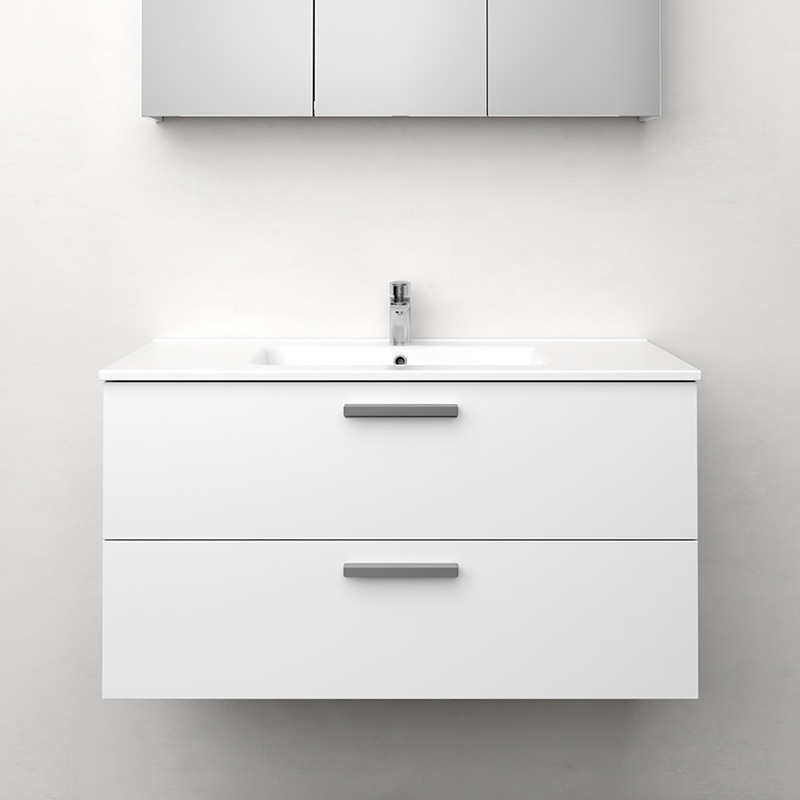 Fuldt udtrækkelige skuffer med dæmpet lukkefunktion og skuffesider i metal. En udtagelig måtte i bunden af skufferne gør, at tingen bliver på deres plads, og desuden letter det rengøringen. Den øverste skuffe har en U-konstruktion med plads til en vandlås. Møblerne er forberedt til både gulv- og vægafløb og har justerbare ophængsbeslag. Fås i hvid mat og antracit. Vi anbefaler afløbssæt 200 720 00, som kun optager lidt plads i møblet. Vælg håndtag, CC32, 96 og 160. Korpusset er færdigmonteret, og fronterne er nemme at montere ved installation.