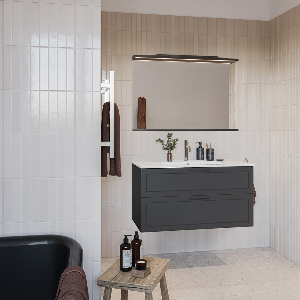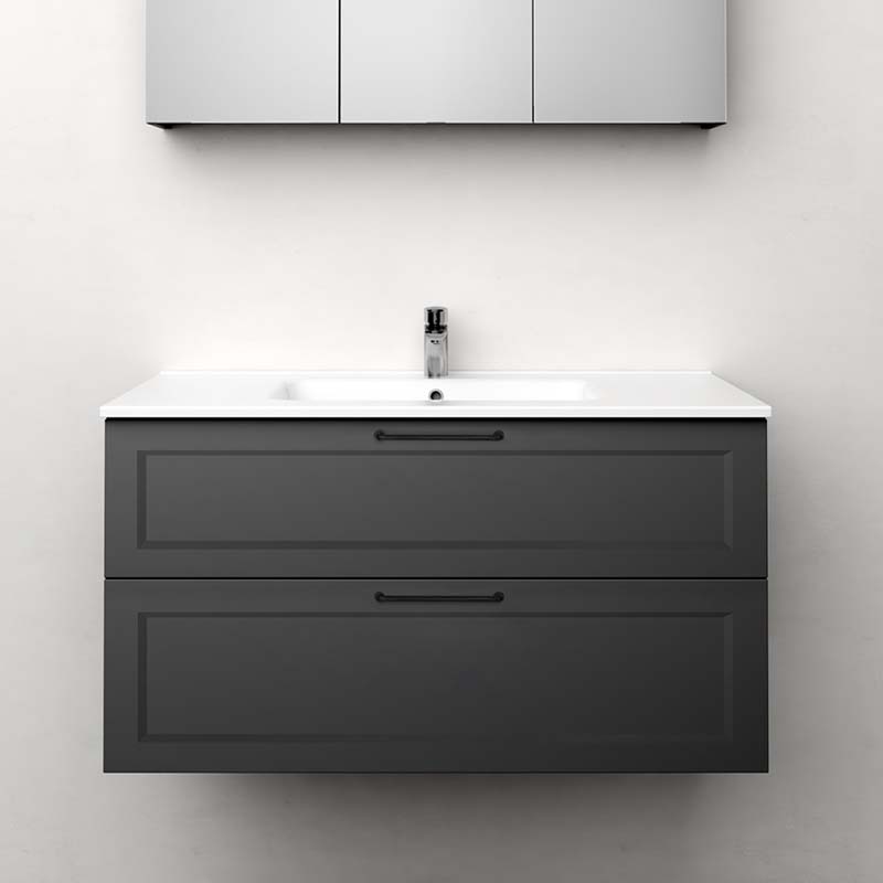 Nejd er et smukt møbel i klassisk stil med rammefronter. Skuffer med med fuld udtræk og skuffesider i metal. En skuffemåtte i bunden af skufferne holder tingene på plads og gør rengøringen nemmere. Den øverste skuffe har en U-konstruktion, der giver plads til vandlås. Møblerne er forberedt til både gulv- og vægafløb og har justerbare ophængsbeslag. Fås i hvid mat og antracit. Vi anbefaler afløbssæt 200 720 00, der optager meget lidt plads i møblerne. Supplér med håndtag.
