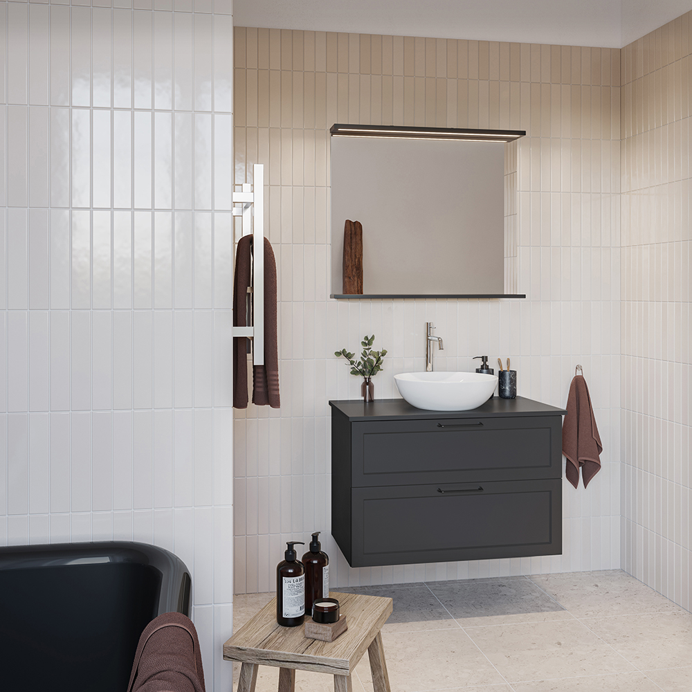 Nejd er et smukt møbel i klassisk stil med rammefronter. Skuffer med med fuld udtræk og skuffesider i metal. En skuffemåtte i bunden af skufferne holder tingene på plads og gør rengøringen nemmere. Den øverste skuffe har en U-konstruktion, der giver plads til vandlås. Møblerne er forberedt til både gulv- og vægafløb og har justerbare ophængsbeslag. Fås i hvid mat og antracit. Vi anbefaler afløbssæt 200 720 00, der optager meget lidt plads i møblerne. Supplér med håndtag.