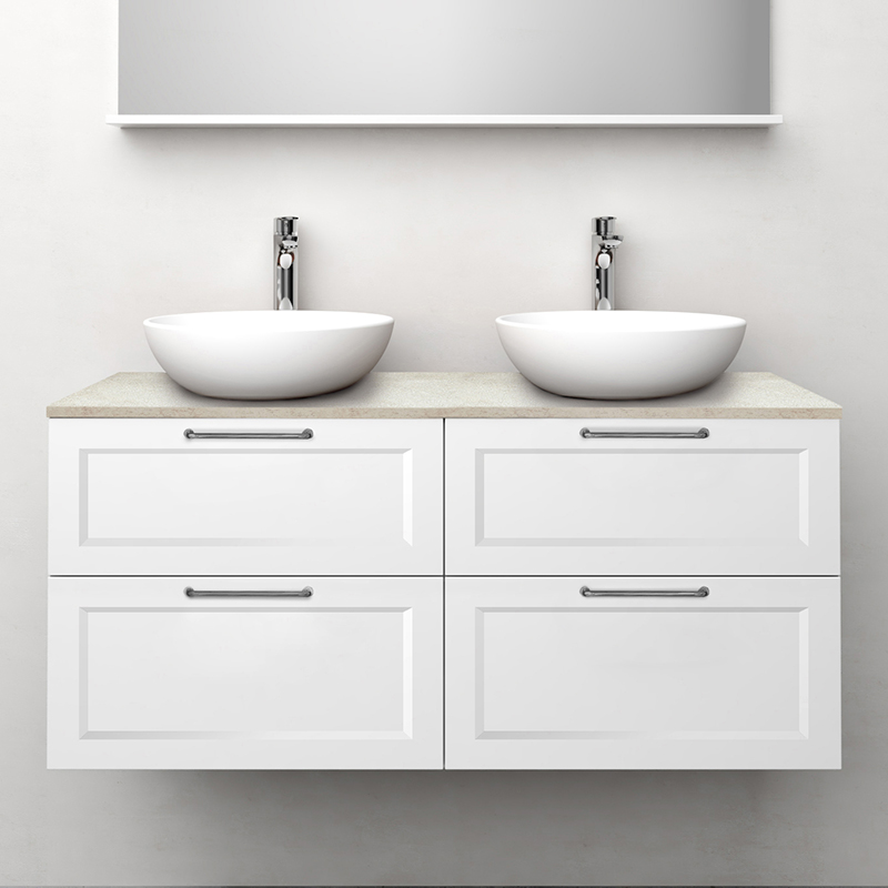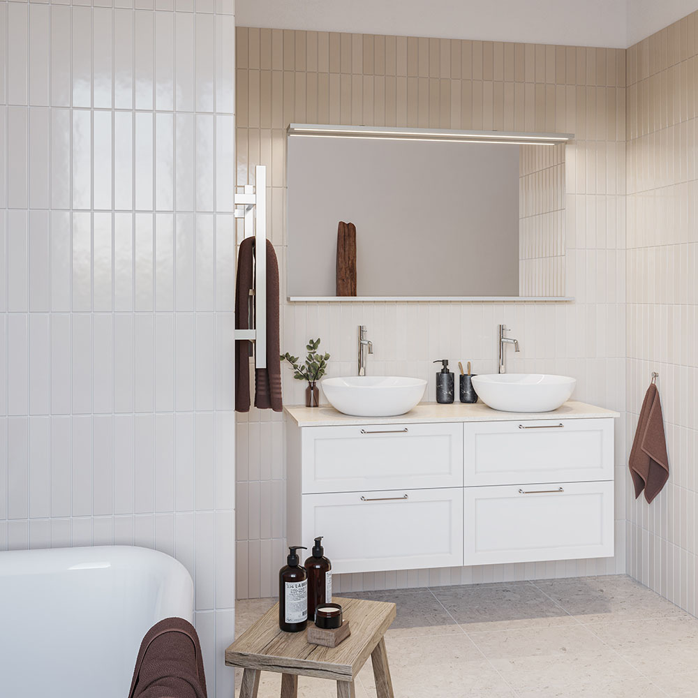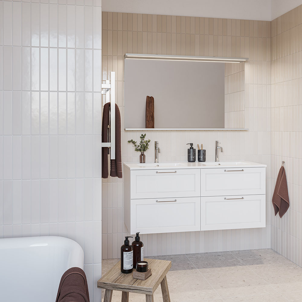 Nejd er et smukt møbel i klassisk stil med rammefronter. Skuffer med med fuld udtræk og skuffesider i metal. En skuffemåtte i bunden af skufferne holder tingene på plads og gør rengøringen nemmere. Den øverste skuffe har en U-konstruktion, der giver plads til vandlås. Møblerne er forberedt til både gulv- og vægafløb og har justerbare ophængsbeslag. Fås i hvid mat og antracit. Vi anbefaler afløbssæt 200 720 00, der optager meget lidt plads i møblerne. Supplér med håndtag.