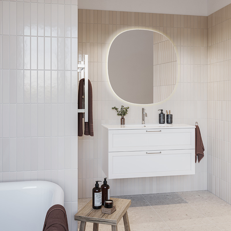 Westerbergs Aura-spejl med belysning tilføjer en blød og organisk afrundet form til dit badeværelse, der skaber harmoni. Bag spejlet breder et varmt hvidt lys sig ud og fylder rummet med et varmt, indbydende skær, der spreder en rolig og behagelig atmosfære.