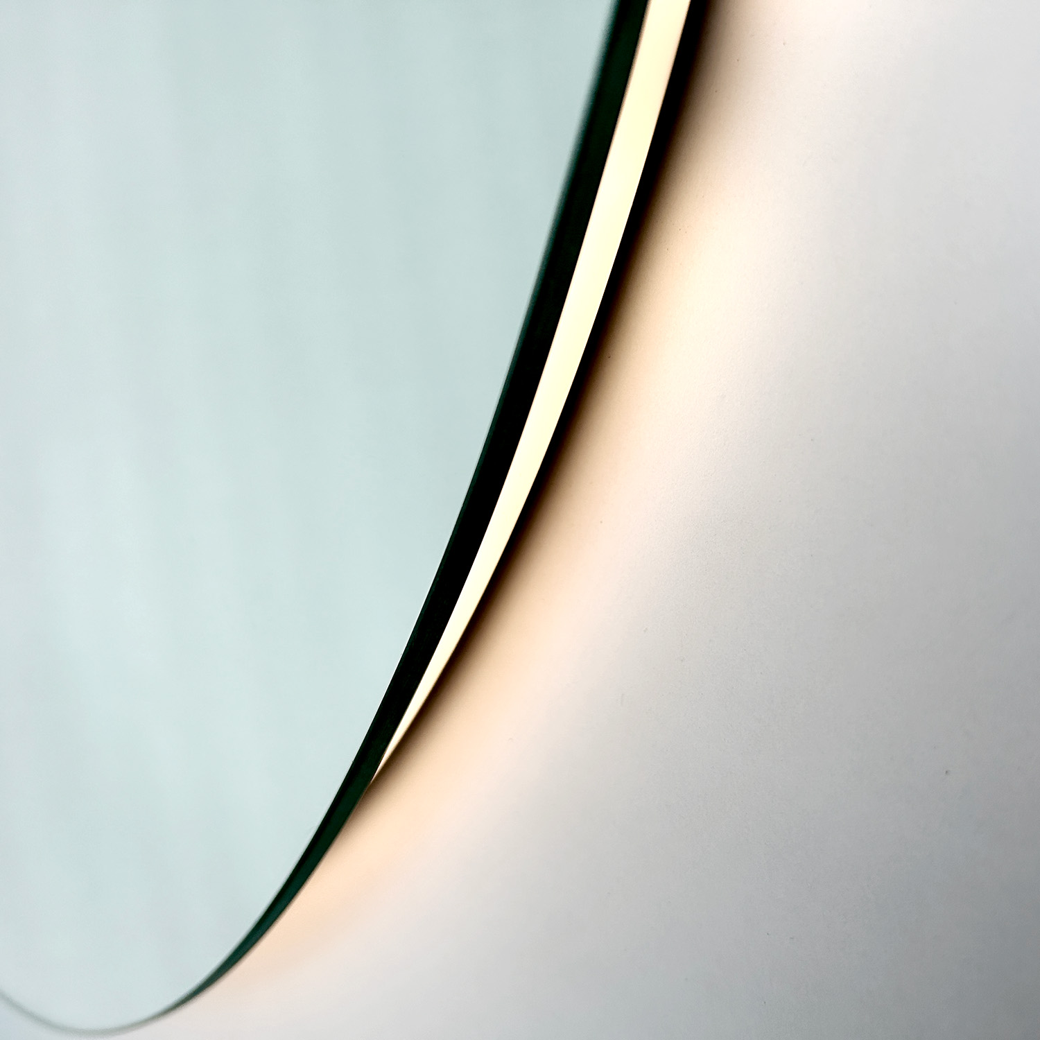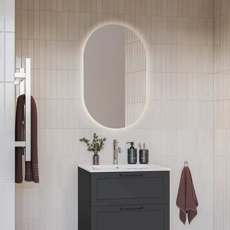 Westerberg Glimt spejl med lys har en oval form og udsender et blødt, varmt hvidt lys, der stråler ud fra kanten og skaber en rolig og elegant atmosfære i dit badeværelse. Med justerbare monteringsbeslag for nem installation. IP44. Kan ikke dæmpes.