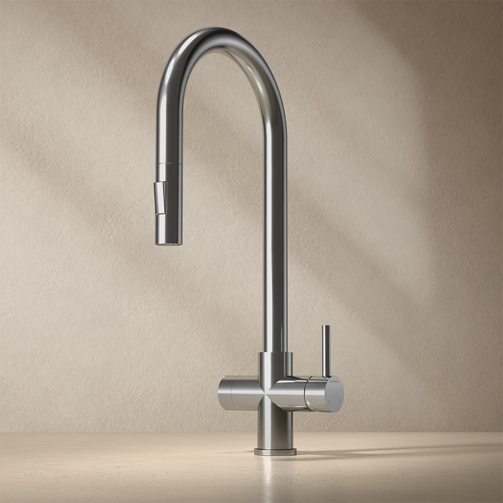 Westerbergs Ciconia XL; elegant, tidløst køkkenarmatur med praktisk frakobling af opvaskemaskine. Fremstillet i rustfrit stål i høj kvalitet. Drejelig og udtrækkelig tud. Nem at montere.