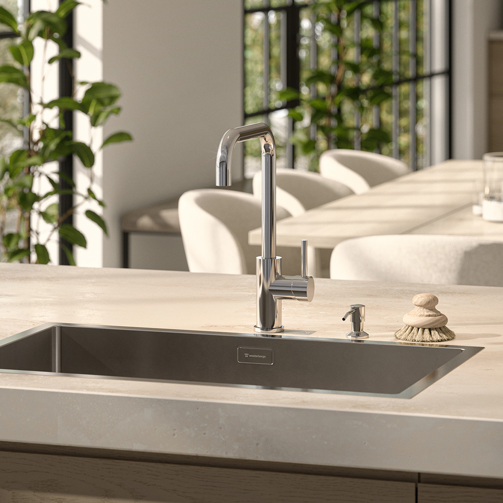 Westerbergs Strix er et elegant køkkenarmatur fremstillet i rustfrit stål af høj kvalitet. Den lige form passer fint under overskabe eller vinduer. Armaturet har en svingbar udløbstud, som gør arbejdet i køkken eller brygges smidigere.