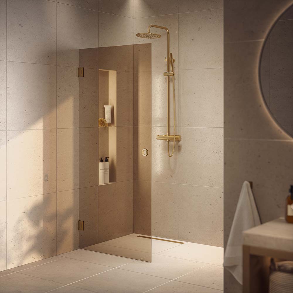 Westerbergs Lynx er en eksklusiv brusedør med slanke beslag og en elegant, integreret grebløsning. Når detaljerne holdes på et minimum, kommer det bronzetonede glas og de smukke detaljer i fokus. Det tidløse design skaber et let og åbent udtryk, som giver badeværelset en følelse af rummelighed og elegance.
