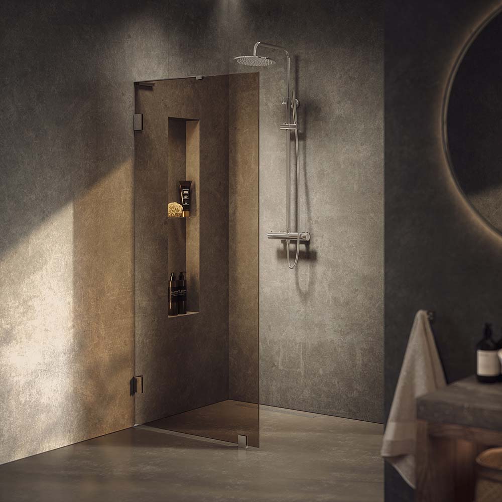 Når designet holdes rent og minimalistisk, kommer det væsentlige i fokus – lyset, fornemmelsen af rummelighed og glassets elegance. Westerbergs Lynx brusevæg i bronzetonet glas er en tidløs bruseløsning med en eksklusiv premiumfølelse, hvor store, røgede glasflader og slanke beslag giver badeværelset et åbent og luftigt udtryk.