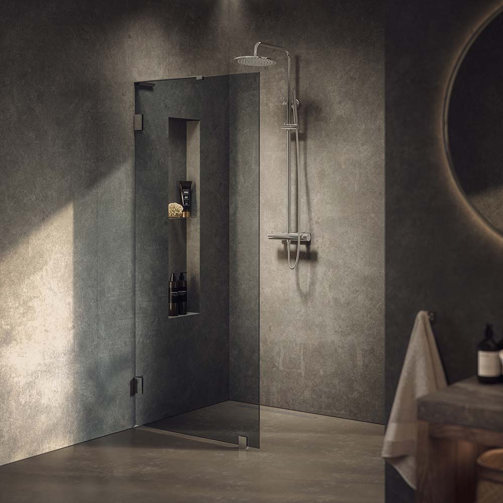 Når designet holdes rent og minimalistisk, kommer det væsentlige i fokus – lyset, fornemmelsen af rummelighed og glassets elegance. Westerbergs Lynx brusevæg i røgt glas er en tidløs bruseløsning med en eksklusiv premiumfølelse, hvor store, røgede glasflader og slanke beslag giver badeværelset et åbent og luftigt udtryk.