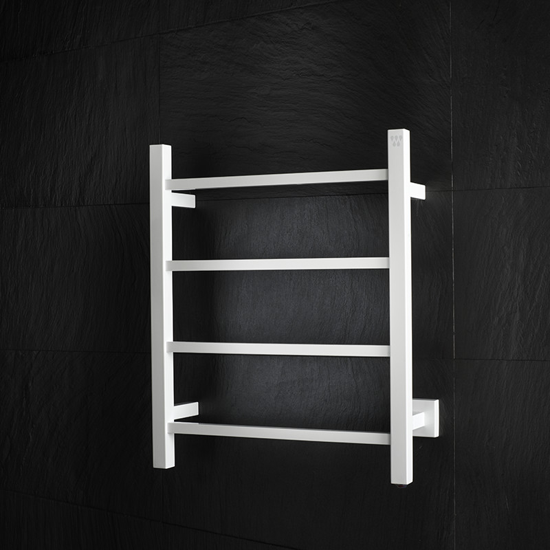 Hvidlakeret håndklædetørrer med lige linjer i rustfrit stål. Inbygget elledning med strømafbryder.