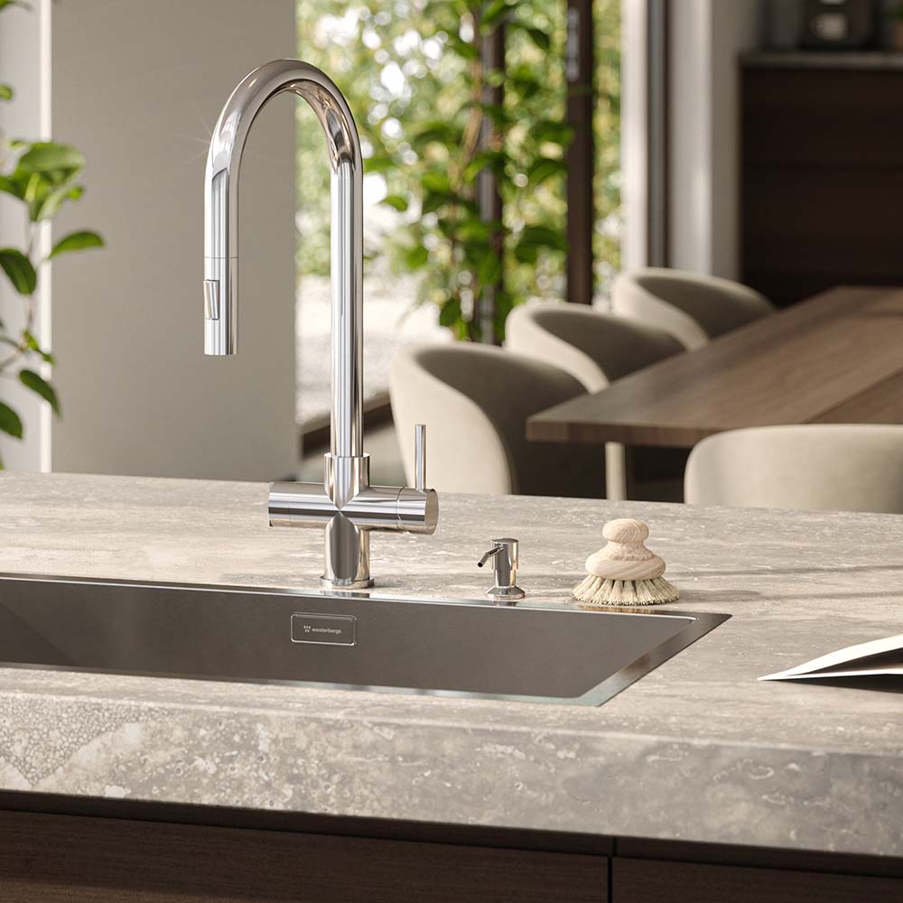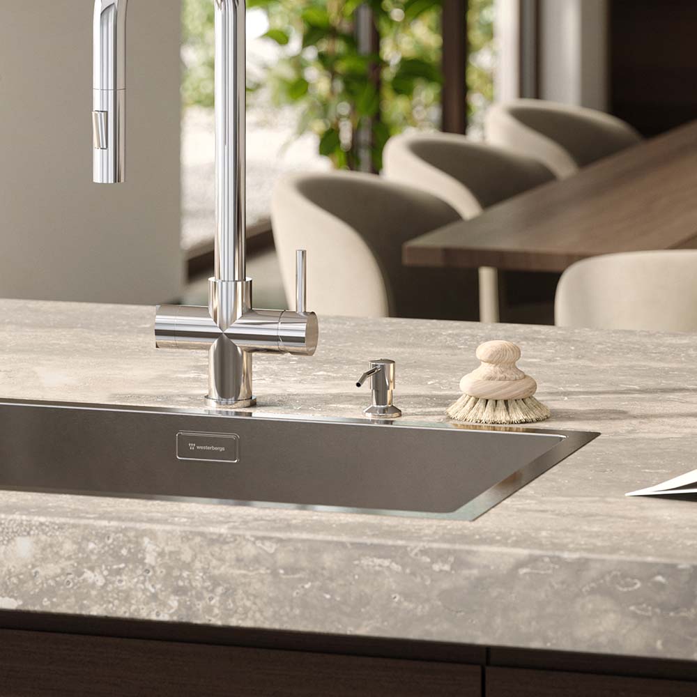 En stilren sæbedispenser, der bliver en elegant og funktionel detalje ved køkkenvasken. Dispenseren monteres direkte i bordpladen og bidrager til et mere afskalet og harmonisk udtryk i køkkenet. Beholderen til opvaskemiddel på 350 ml er skjult under bordpladen.