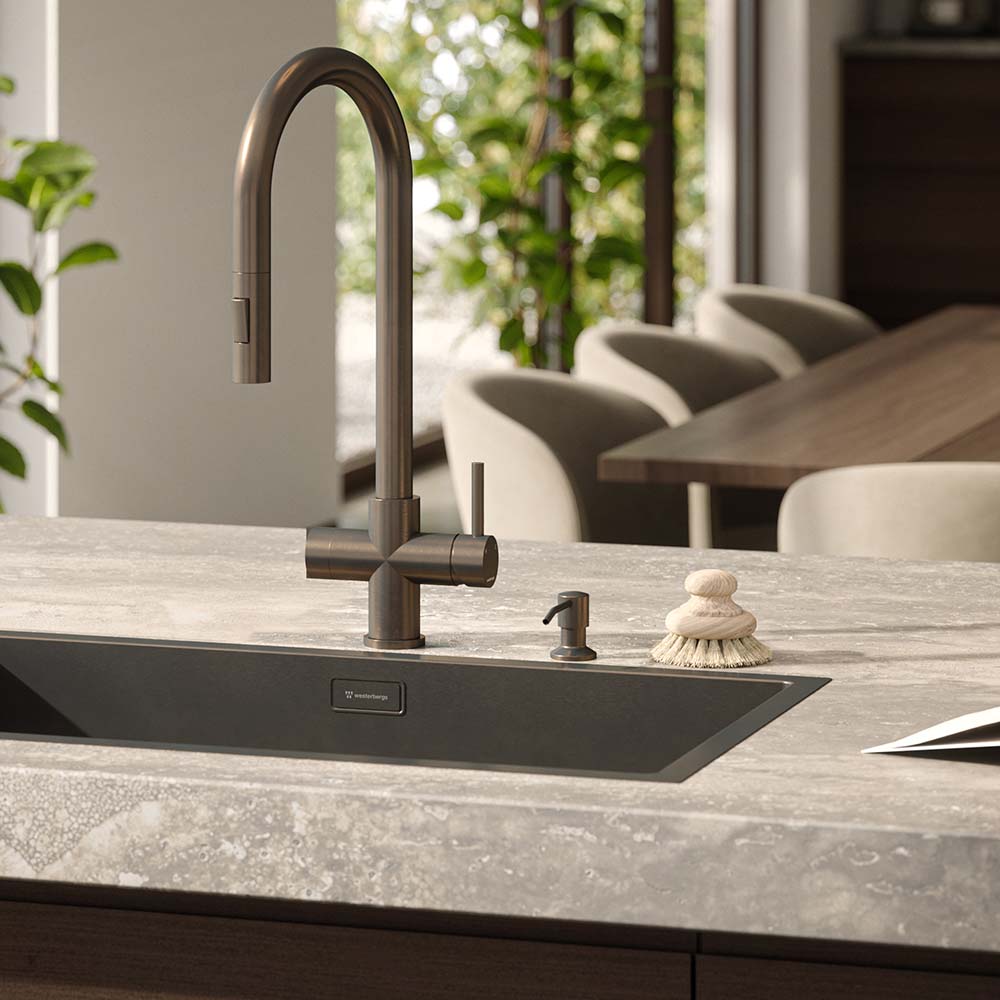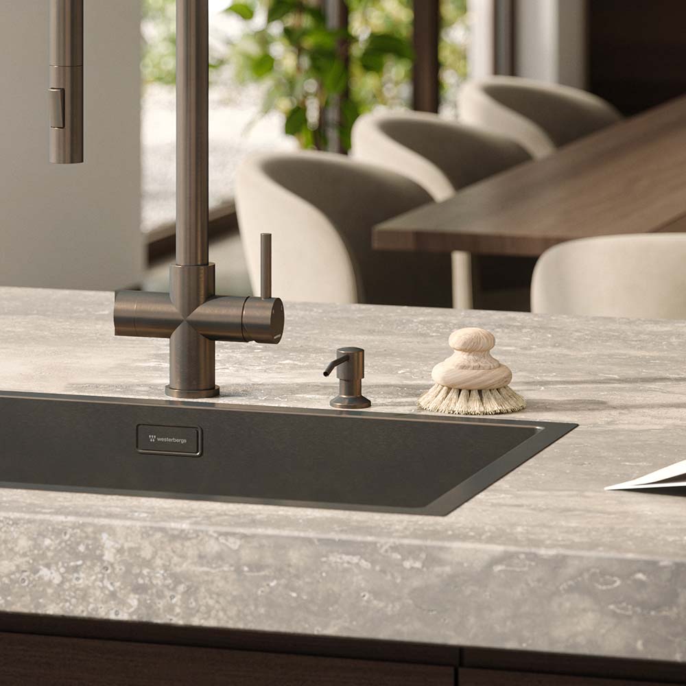 En stilren sæbedispenser, der bliver en elegant og funktionel detalje ved køkkenvasken. Dispenseren monteres direkte i bordpladen og bidrager til et mere afskalet og harmonisk udtryk i køkkenet. Beholderen til opvaskemiddel på 350 ml er skjult under bordpladen.
