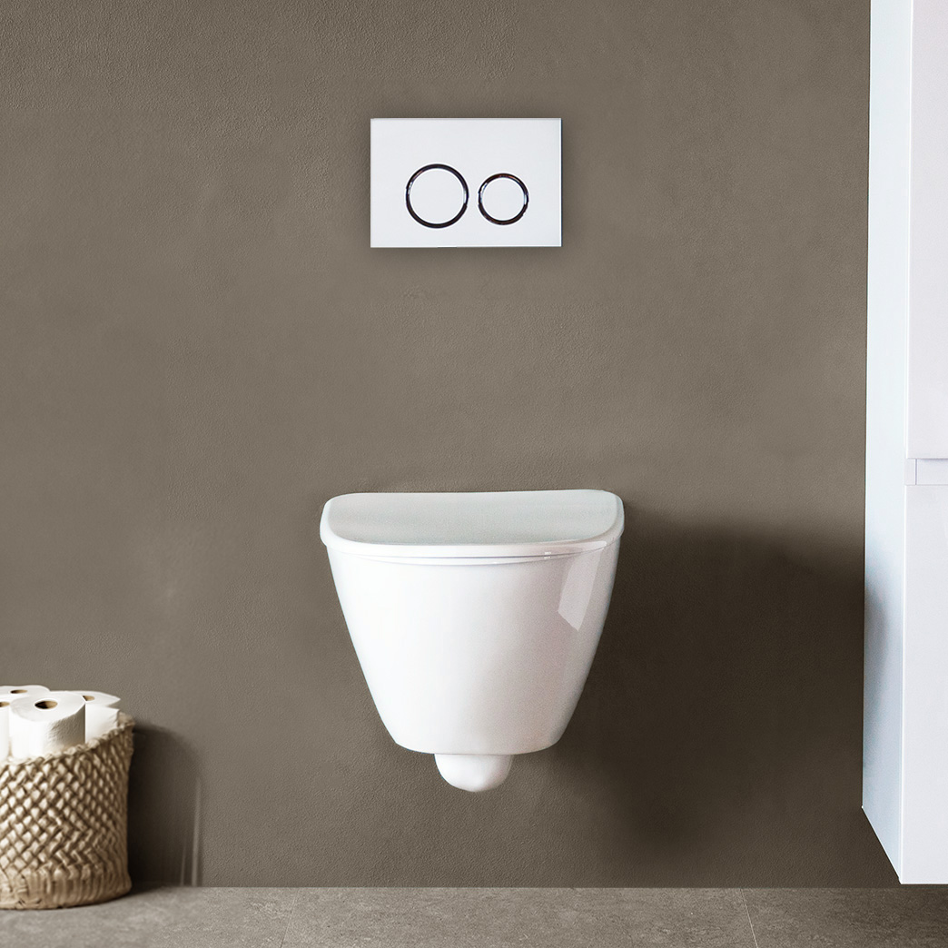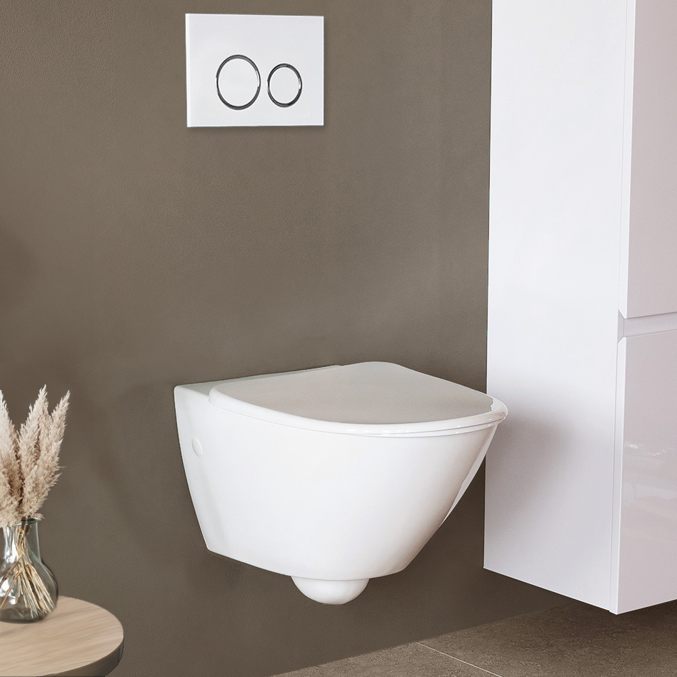 - Komplet væghængt toilet Inklusiv skyllesystem, skylleknap og blødt toiletsæde Moderne formsprog