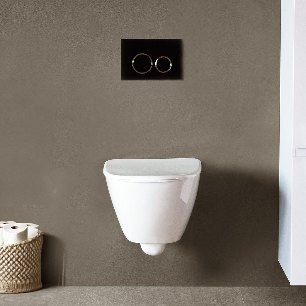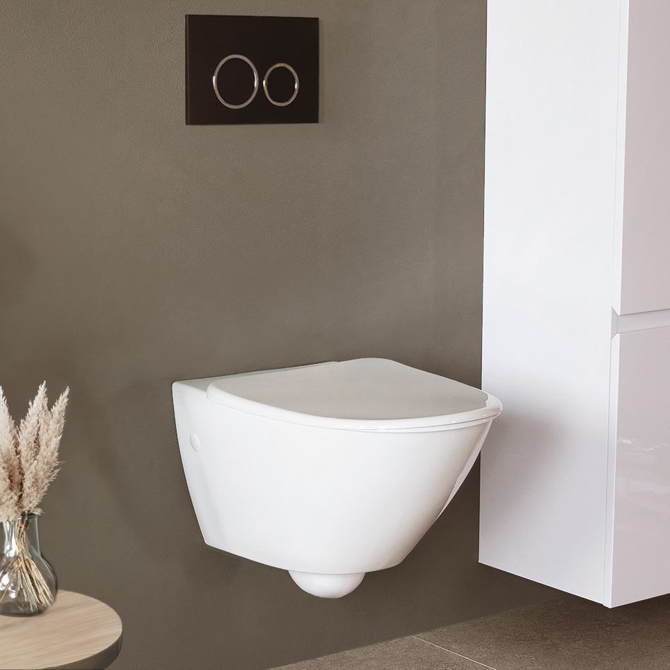 - Komplet væghængt toilet Inklusiv skyllesystem, skylleknap og blødt toiletsæde Moderne formsprog