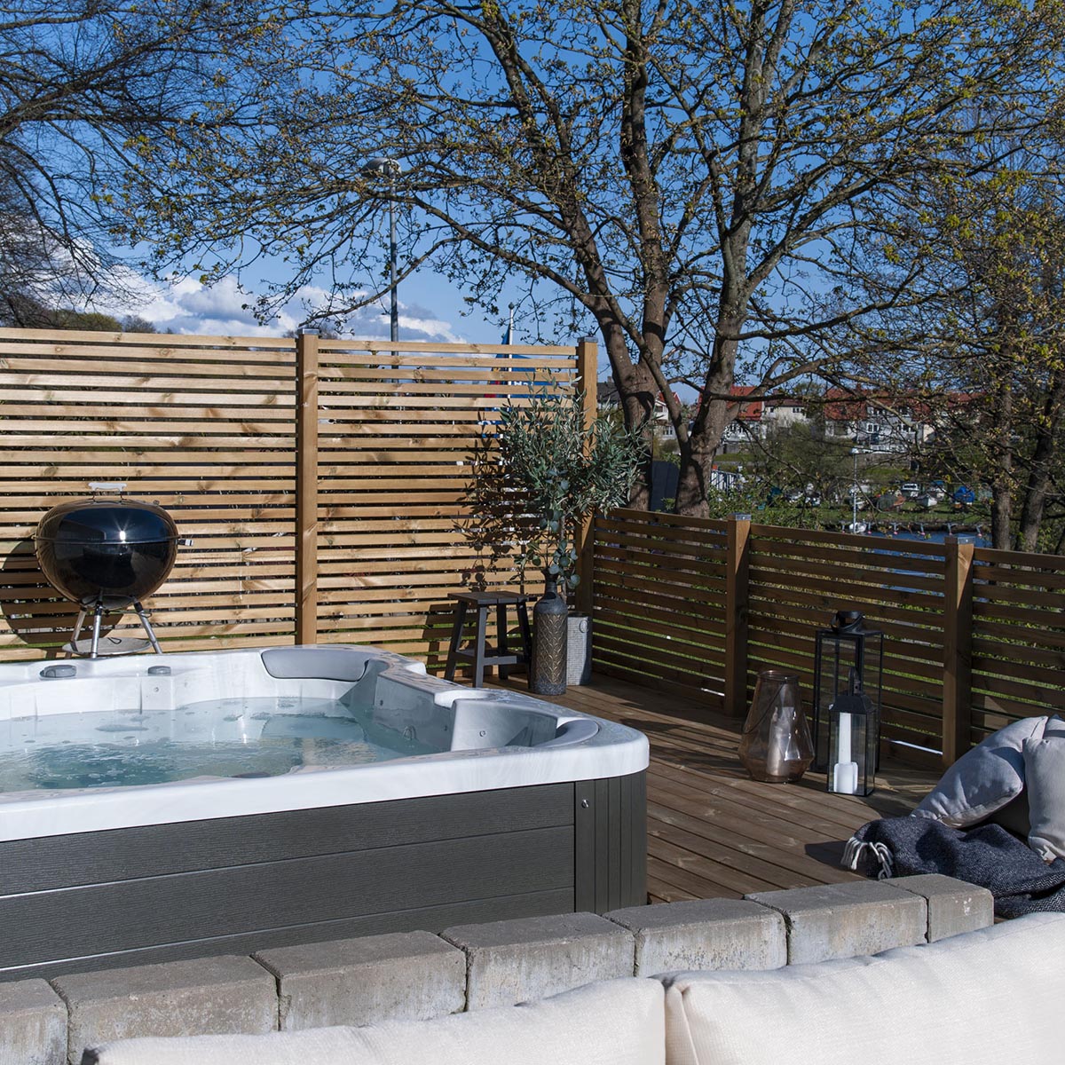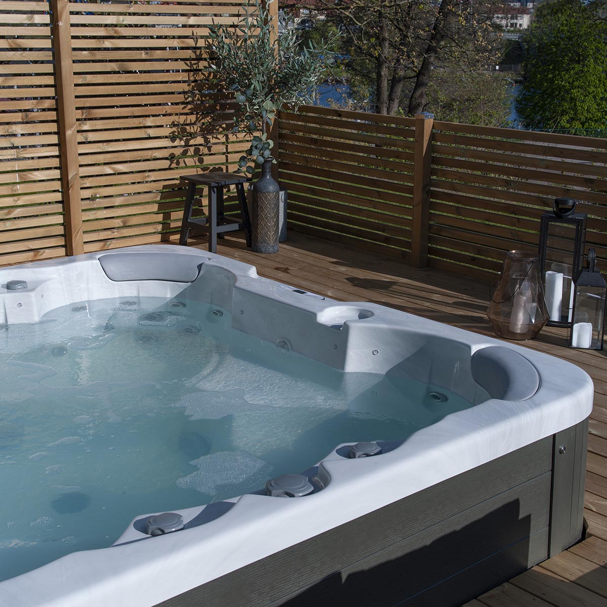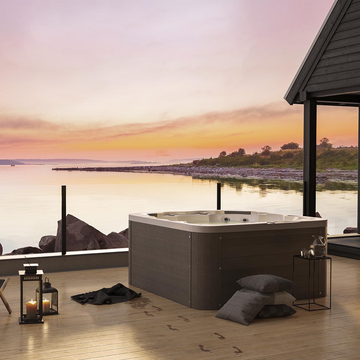Sandhamn udendørs spabad med termolåg er til dig, der ønsker et mindre spabad, men ikke ønsker at give afkald på udstyr. Sandhamn har fem siddepladser og en loungeplads. Spabadet er udstyret med 42 jets, tredobbelt isolering og belysning i vandlinjen.