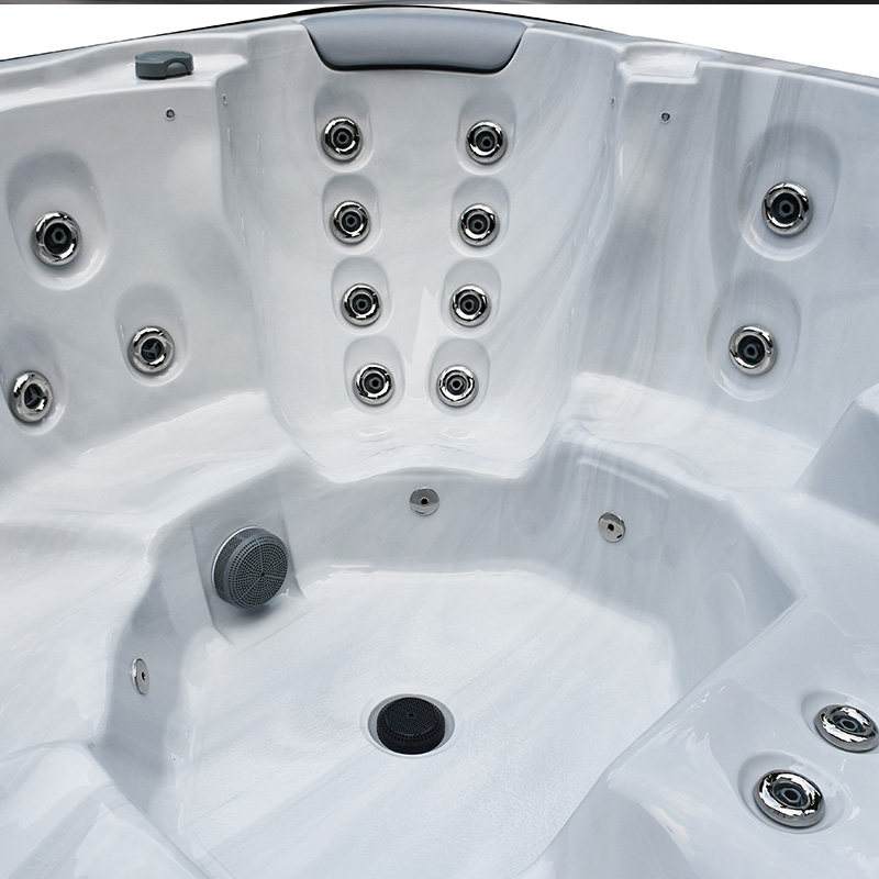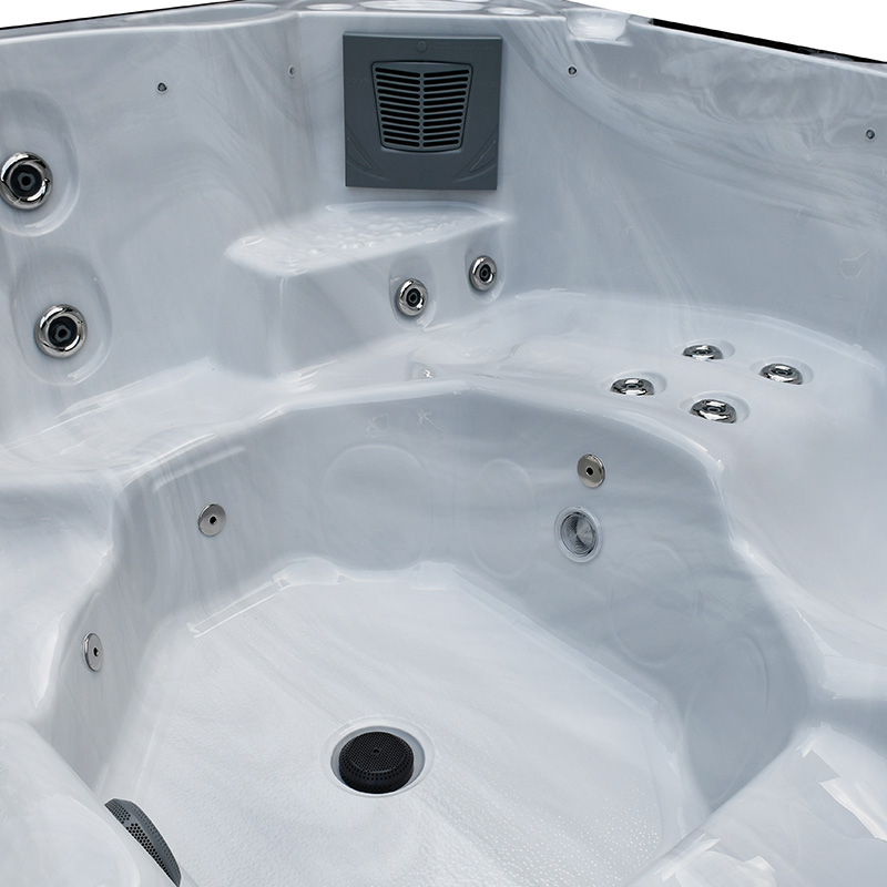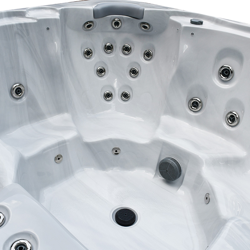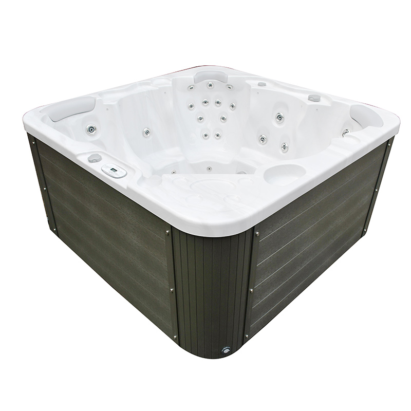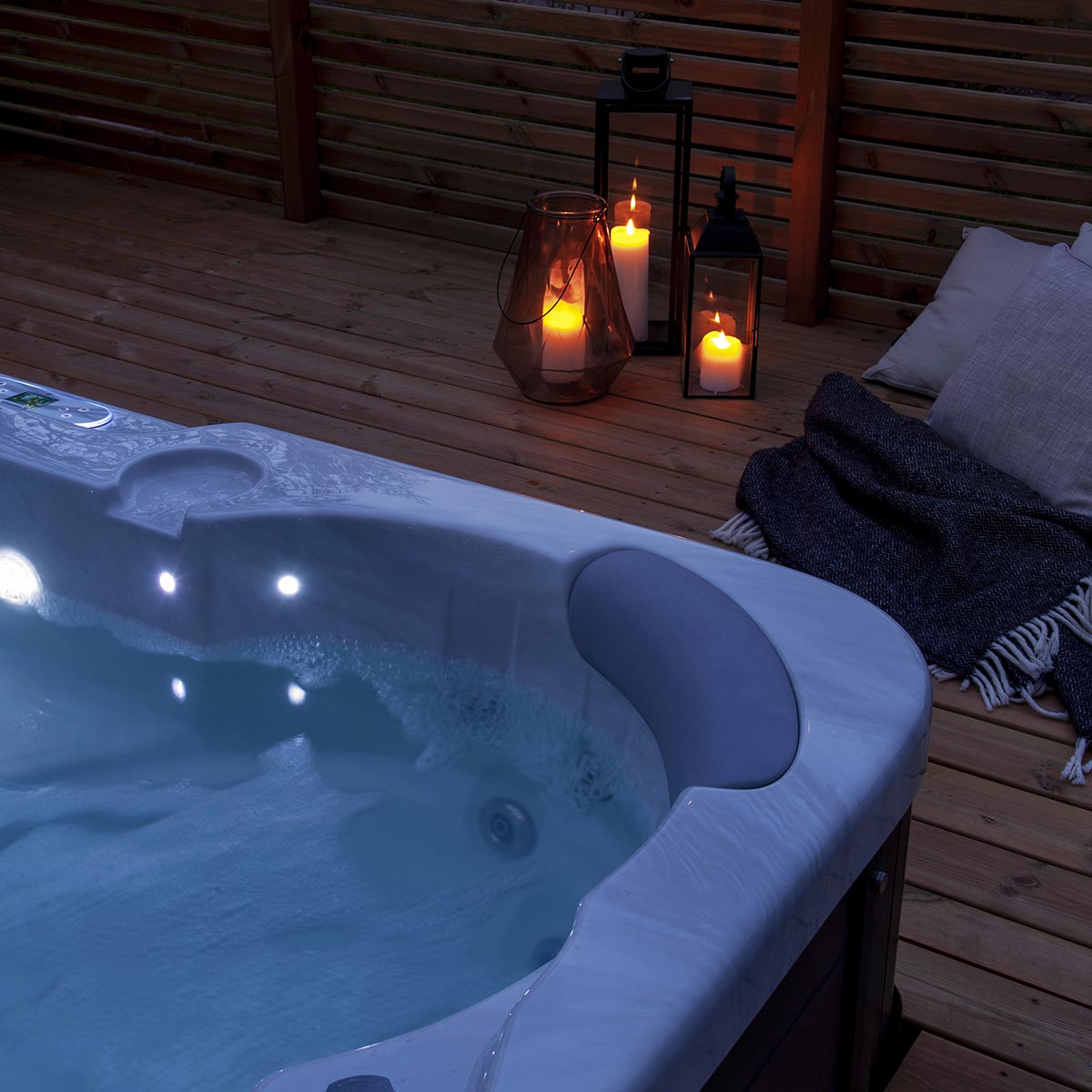 Sandhamn udendørs spabad med termolåg er til dig, der ønsker et mindre spabad, men ikke ønsker at give afkald på udstyr. Sandhamn har fem siddepladser og en loungeplads. Spabadet er udstyret med 42 jets, tredobbelt isolering og belysning i vandlinjen.